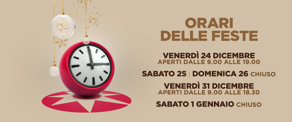 Il Centro Commerciale Grotte Center sarà chiuso sabato 1* Gennaio. Ci rivediamo Domenica 2 Gennaio con orario continuato dalle 09:00 alle 20:30. Ti aspettiamo e ti auguriamo Buon Anno!