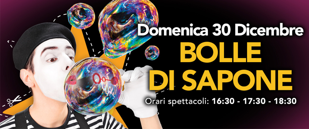Domenica 30 Dicembre lasciati incantare dalle forme delle bolle di sapone! Orari degli spettacoli: 16:30 - 17:30 - 18:30 Cosa aspetti?