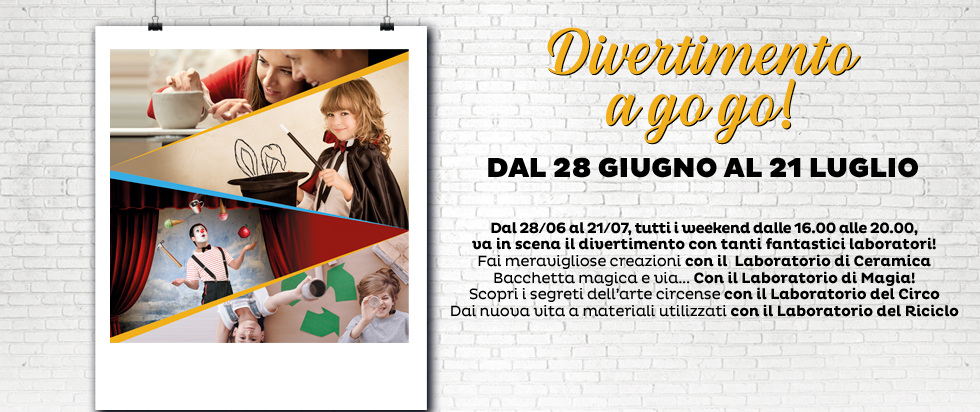 Ogni fine settimana, dal venerdì alla domenica tanti laboratori creativi per far divertire il tuo bambino con attività sempre diverse! L'attività inizierà alle ore 16:00 e terminerà alle ore 20:00 a partire da Venerdì 28 Giugno fino a Domenica 21 Luglio